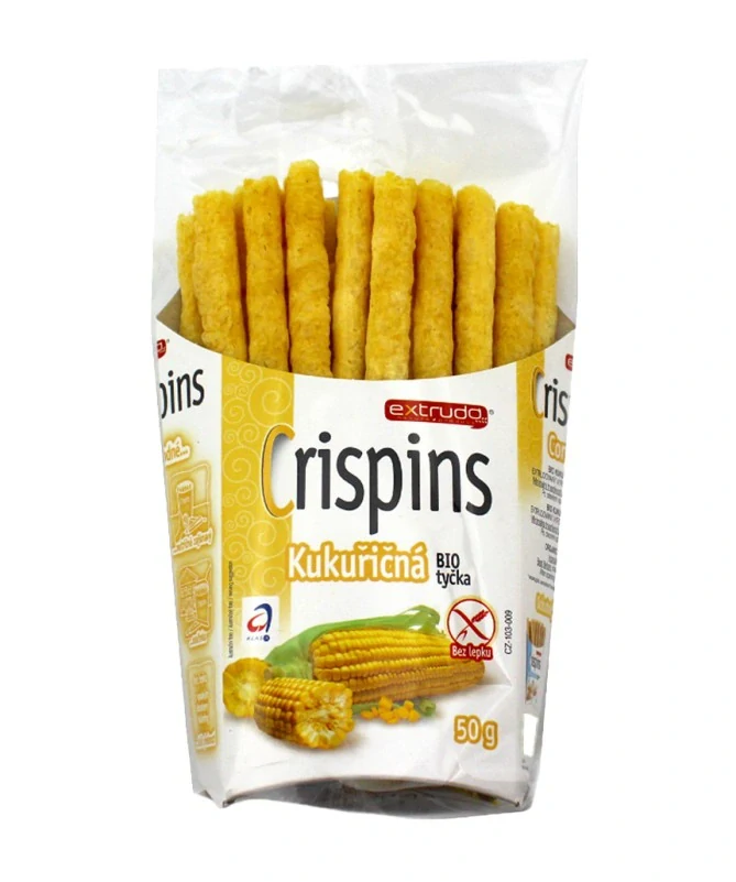Křehké bezlepkové tyčinky Crispins Bio jsou extrudované křupavé tyčinkynky v biokvalitě s vysokým obsahem vlákniny a nízkým obsahem tuku a soli, bez přidaného cukru, vyrobené z kukuřičné mouky, kde kukuřice je přirozeně bezlepkovou a nutričně velmi bohatou potravinou, má vysoký obsah vitamínů skupiny B a obsahuje rovněž minerální látky jako je železo, hořčík, zinek, mangan a selen.