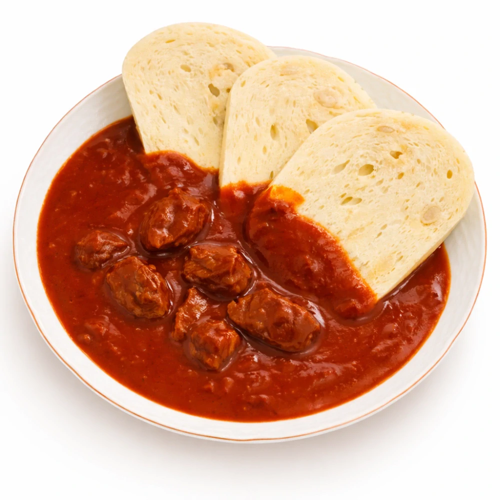 Složení: Hovězí maso (přední), hovězí vývar, cibule, vepřové sádlo,rajčatový protlak, kmín, sůl, pepř, paprika, bobkový list, majoránka, rýžová mouka.