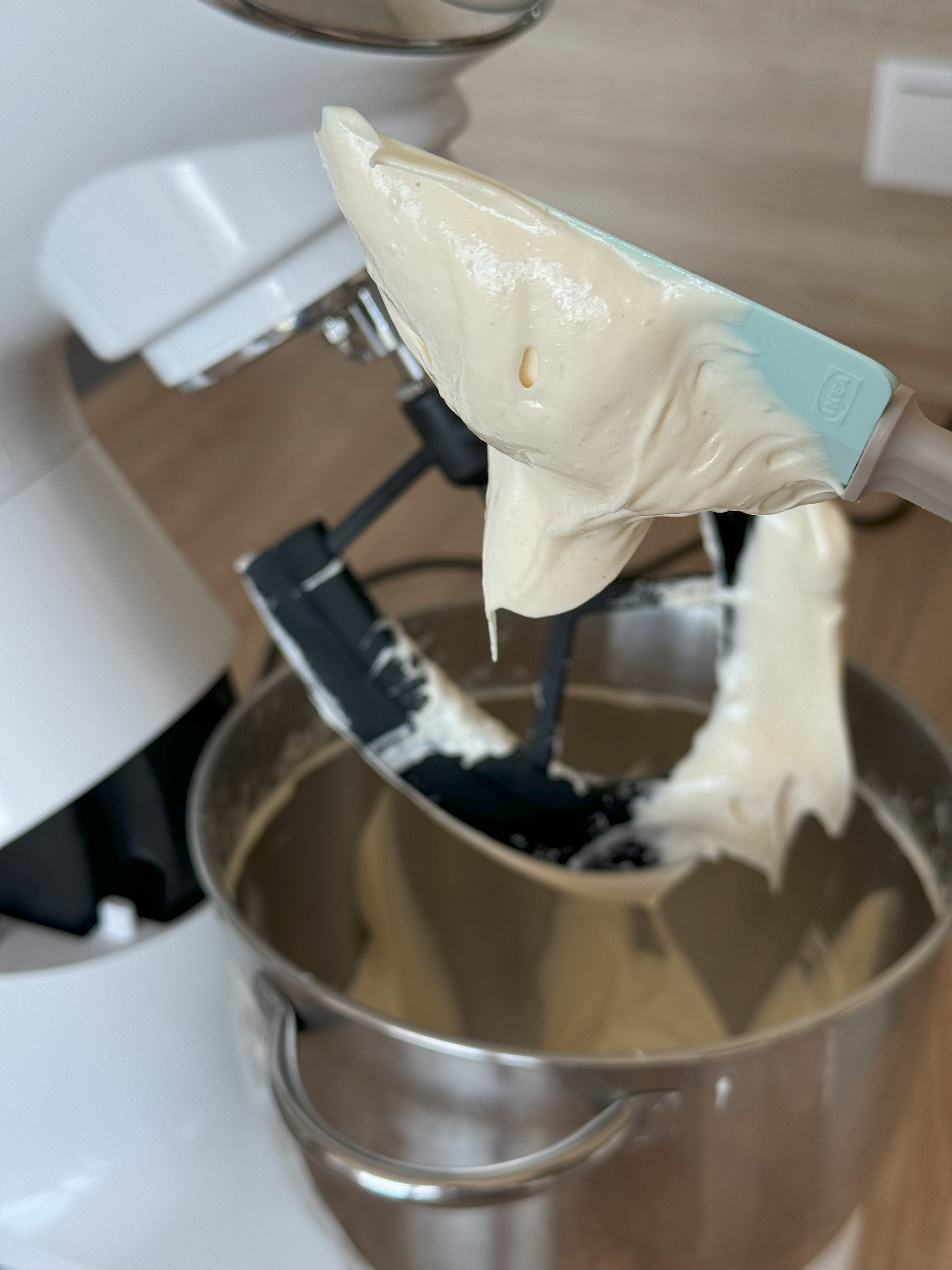 Veškeré suroviny vložíme do kuchyňského robota a necháme 5 minut šlehat dokud se nám nevytvoří těsto o konzistenci pěny na holení.