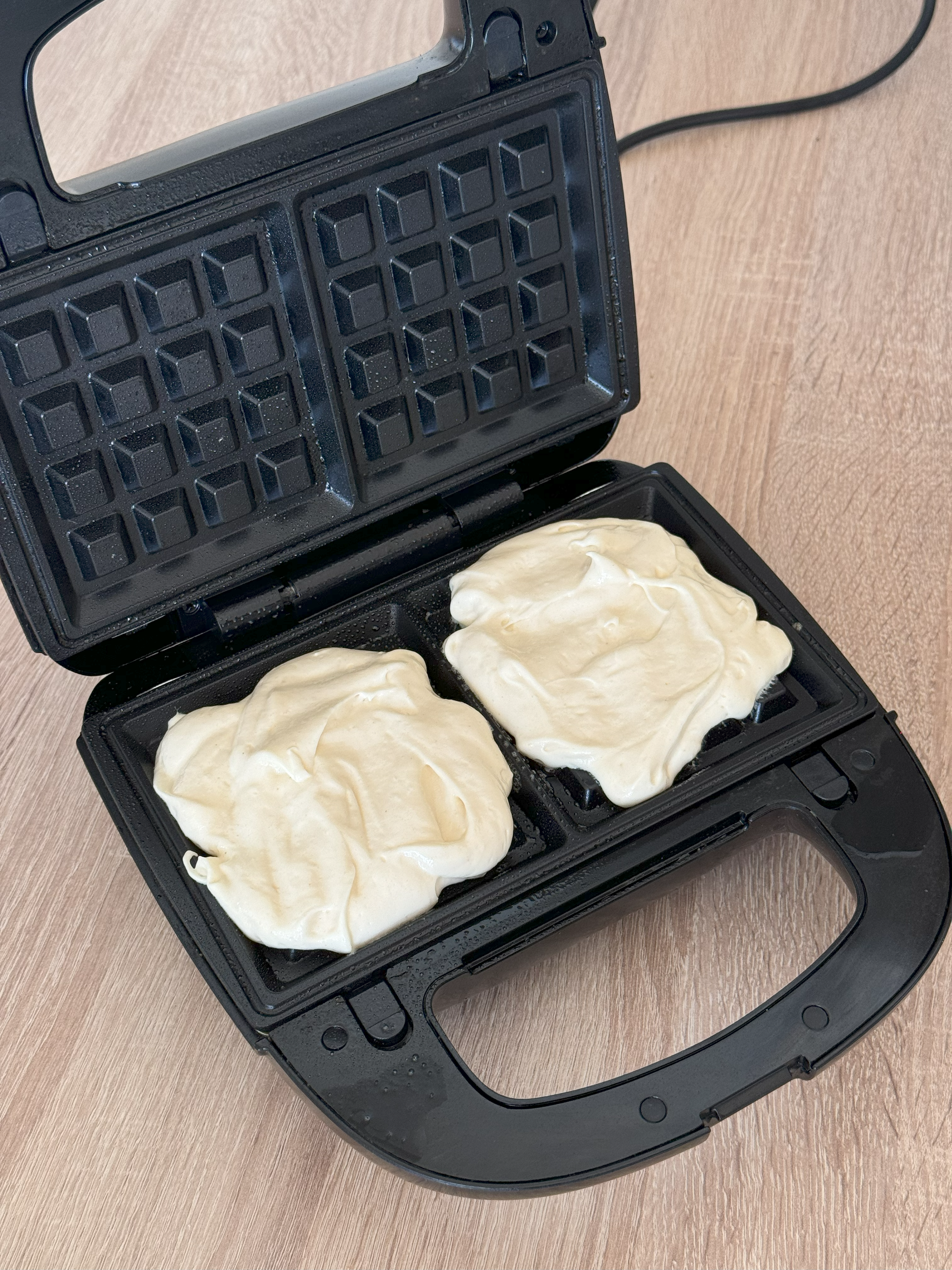 Dále si rozehřejeme waflovač, který trochu omastíme aby se nám wafle daly jednoduše vyklopit - já použil olej ve spreji. Následně vložíme podle velikosti stroje množstí těsta a pečeme alespoň 7 minut.
