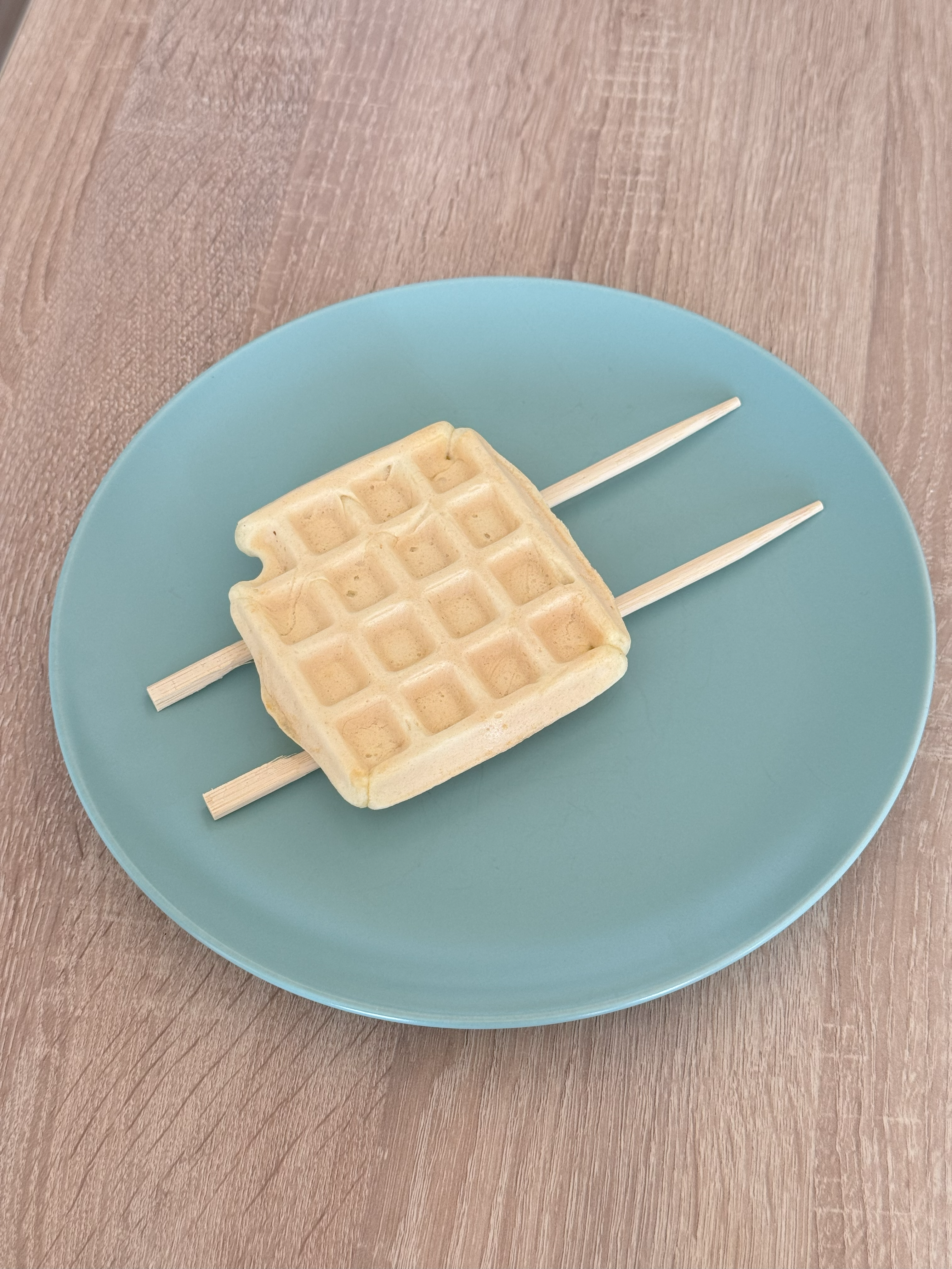 Hotové wafle vytáhneme a necháme vychladnout tak, aby se zbytečně zespod nezapařily. viz. foto, kdy jsem je dal na dřevěné hůlky. A jak můžete vidět, pokud použijete do těsta vodu, wafle budou značně světlejší. Chuťově i strukturově jsou naprosto famózní, jen ta barva může trochu děstit.