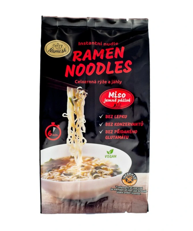Bezlepková nudlová instantní polévka Miso od značky Ňamish Ramen Noodles je veganská polévka s bezlepkovými nudlemi vyrobenými z celozrnné rýže a jáhel. Aromatický jemně pálivý vývar s mořskou řasou wakame zasytí nejen doma, ale také v také v práci a na cestách. Polévka Ňamish je vhodnou a praktickou volbou pro rychlé a teplé jídlo.